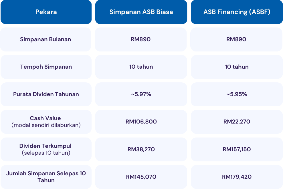 ASB Financing (ASBF) adalah pinjaman bank untuk membeli unit ASB. Pelabur akan terima dividen atas unit yang dibeli, dan membayar ansuran pinjaman kepada bank setiap bulan. (Info lanjut boleh dibaca dalam risalah ASNB Financing – pautan akan disediakan.)